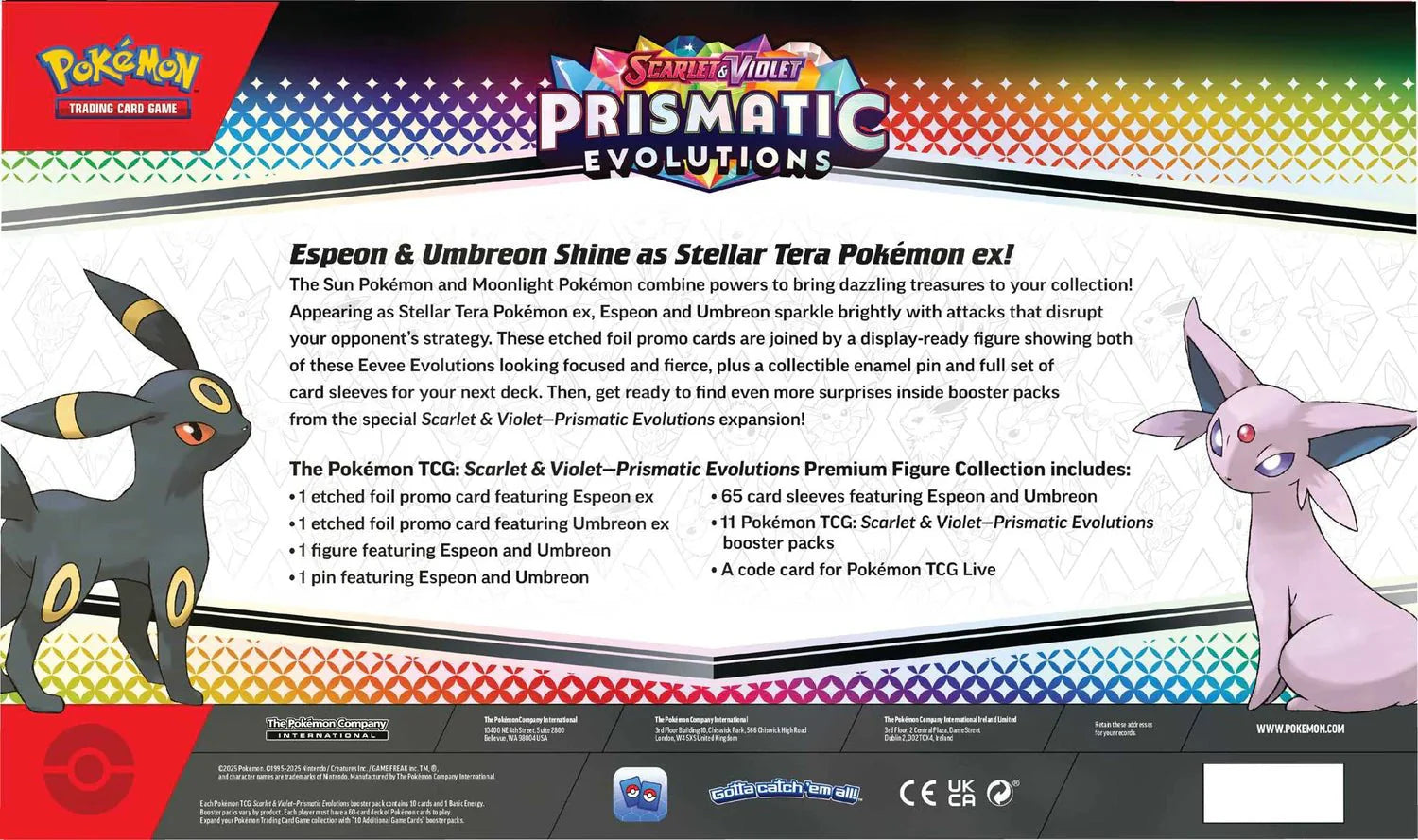 Designed to celebrate two of the most beloved Eeveelutions, the set combines visual appeal with gameplay value, including booster packs from the latest Scarlet & Violet – Prismatic Evolutions expansion and a code card for Pokémon TCG Live.