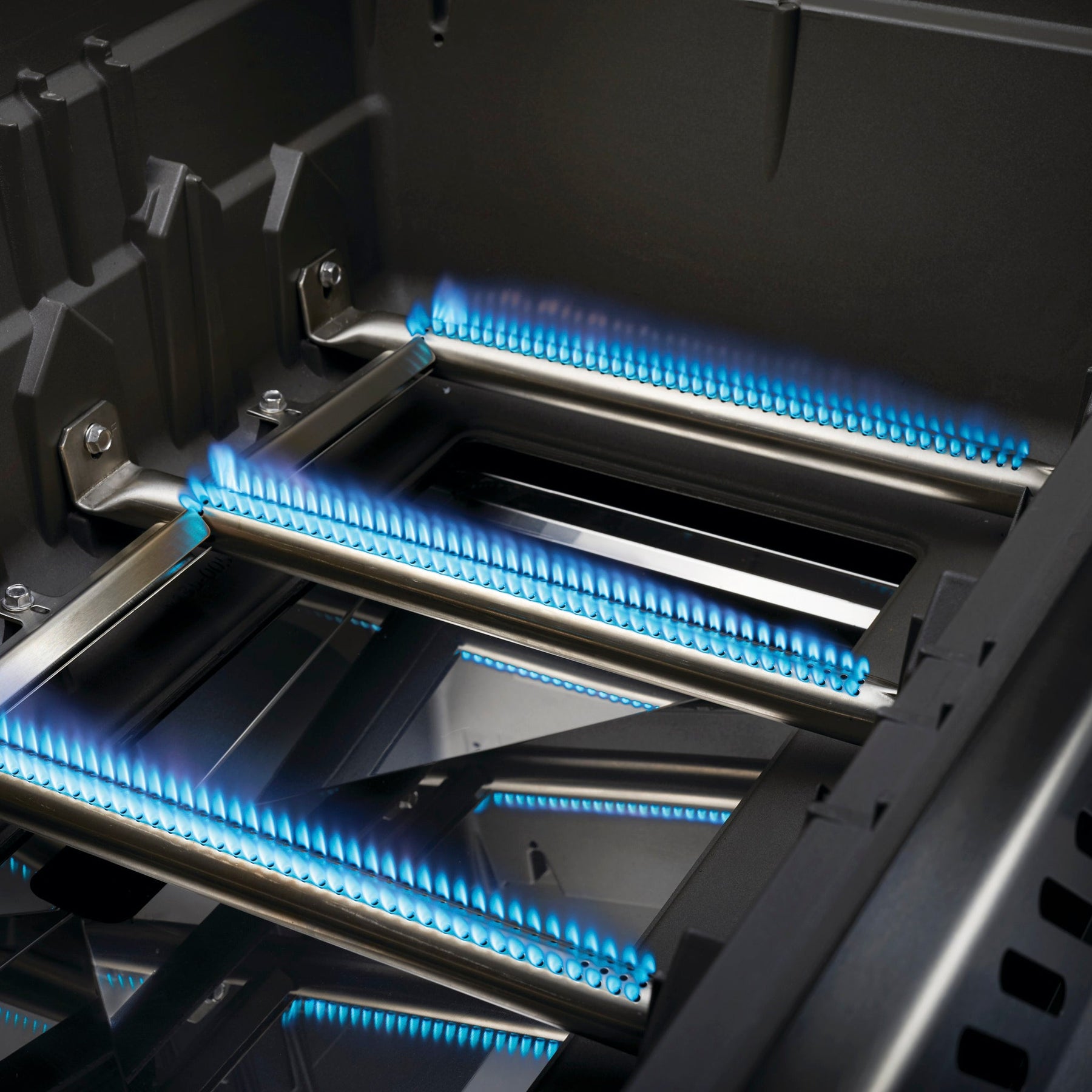 Napoleon's Rogue® XT 425 Stainless Steel Propane Gas Grill with Infrared Side Burner has three burners, cast iron grids and a high top lid. This grill lights easily, every time, with a battery-free ignition. Grill the perfect steak using the integrated sizzle zone side burner or use it to make sauces and sides while grilling, and searing on the main area. The durable materials are both stylish and easy to maintain.