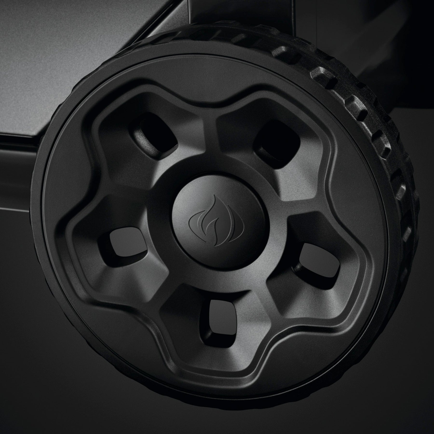 Get the perfect sear over the cast iron porcelainized enamel cooking grids. Four stainless steel burners provide even heat, easily controlled and monitored by the onboard temperature gauge. The rugged wheels allow this barbecue to go where the action is, while the easy-to-fold side shelves, featuring tool hangers and a bottle opener, make sure that the Freestyle meets your lifestyle and space.